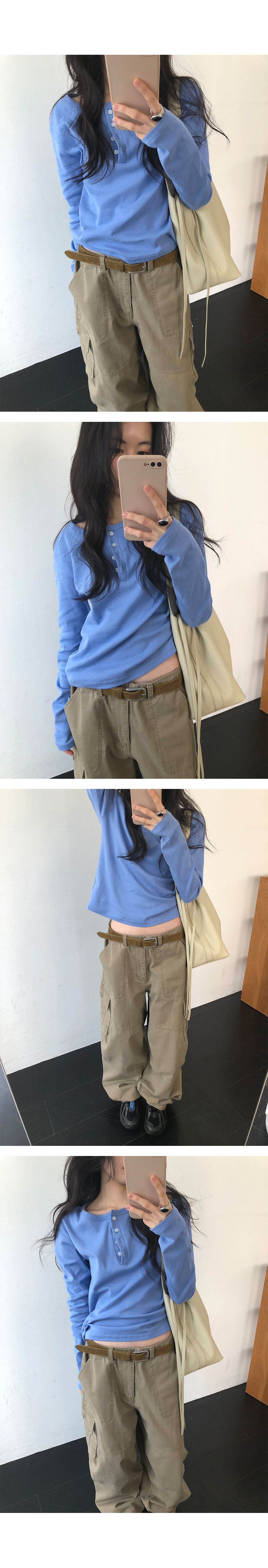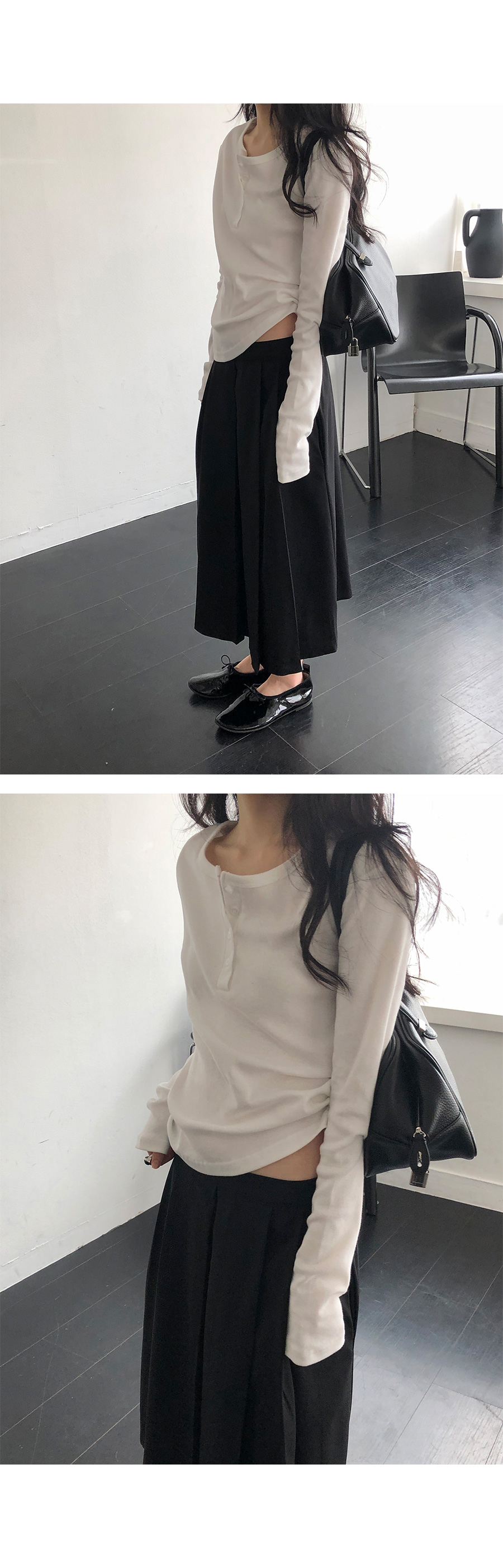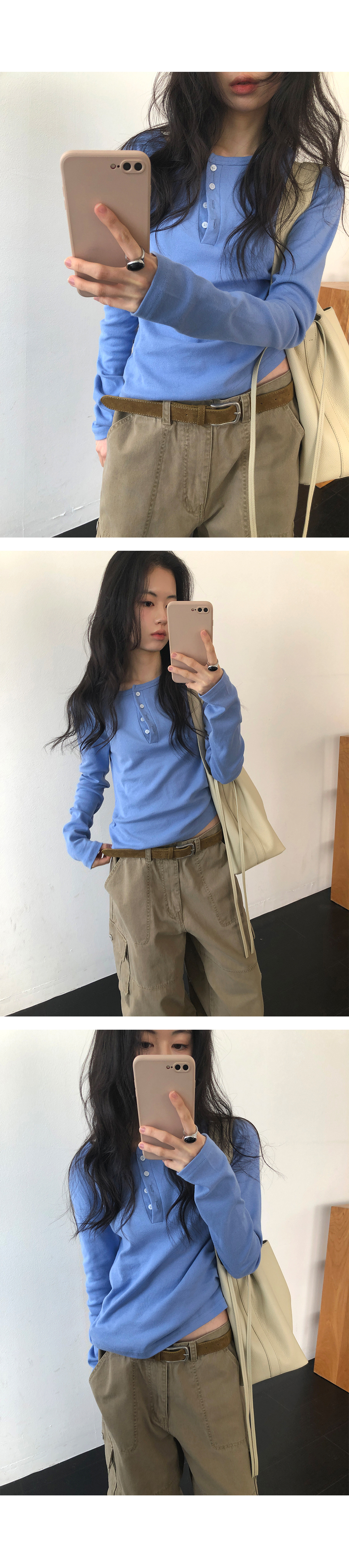 這是一款充滿現代簡約感的 亨利領(Henley Neck) 日常上衣。選用 100% 純棉材質,觸感鬆軟且具有優異的延展性,穿在身上能感受到細膩的親膚感,完全沒有束縛感。厚薄度拿捏得非常精準,冬天適合藏在大衣裡當底層,春天則非常推薦單穿或做層次疊搭。