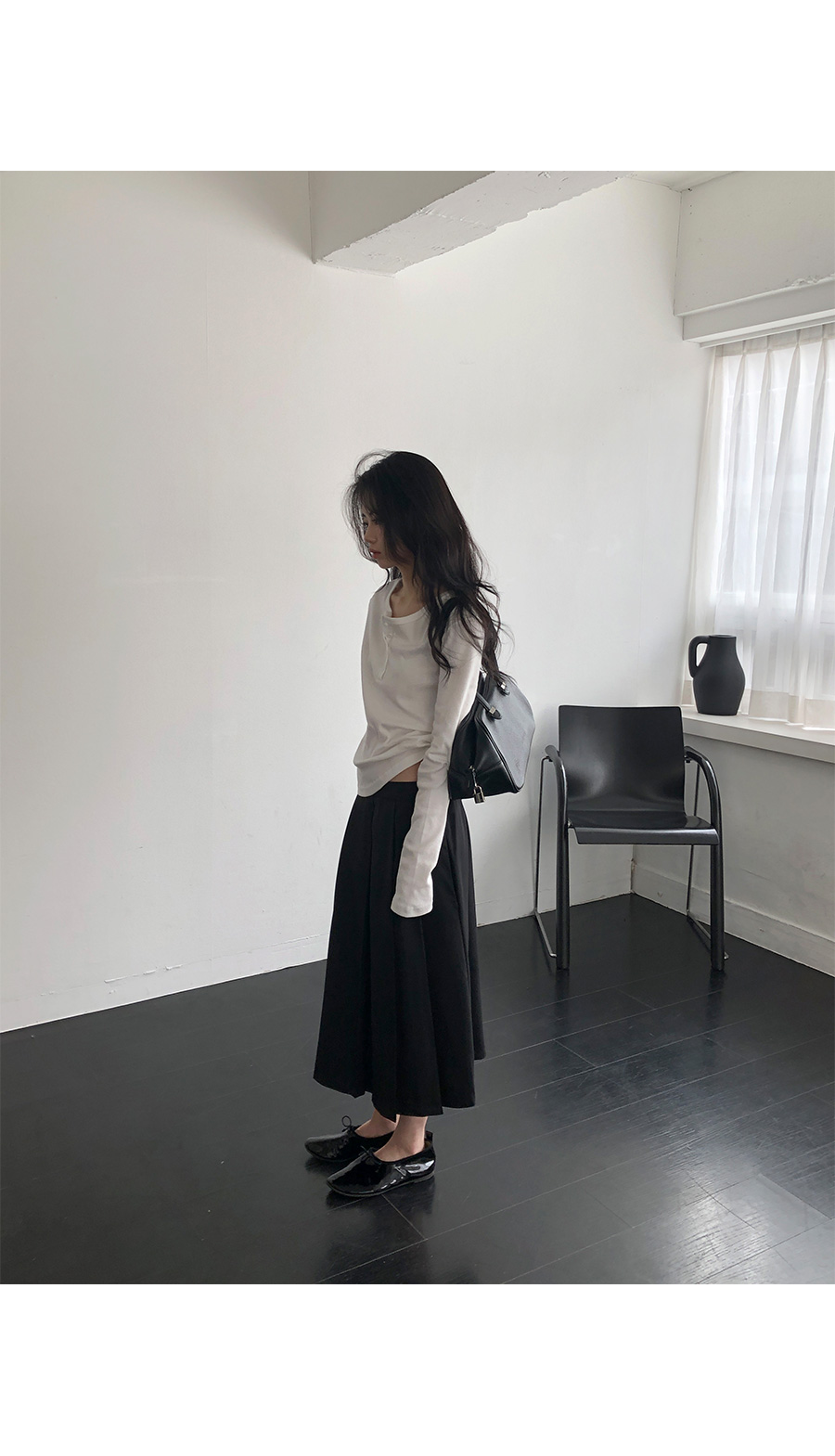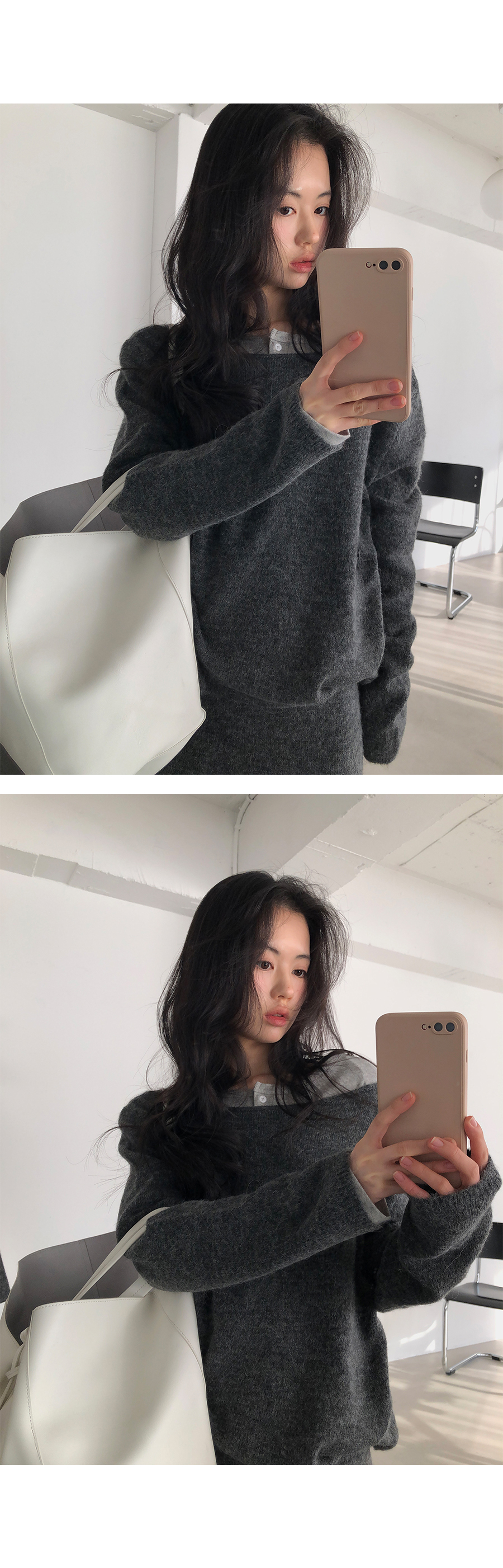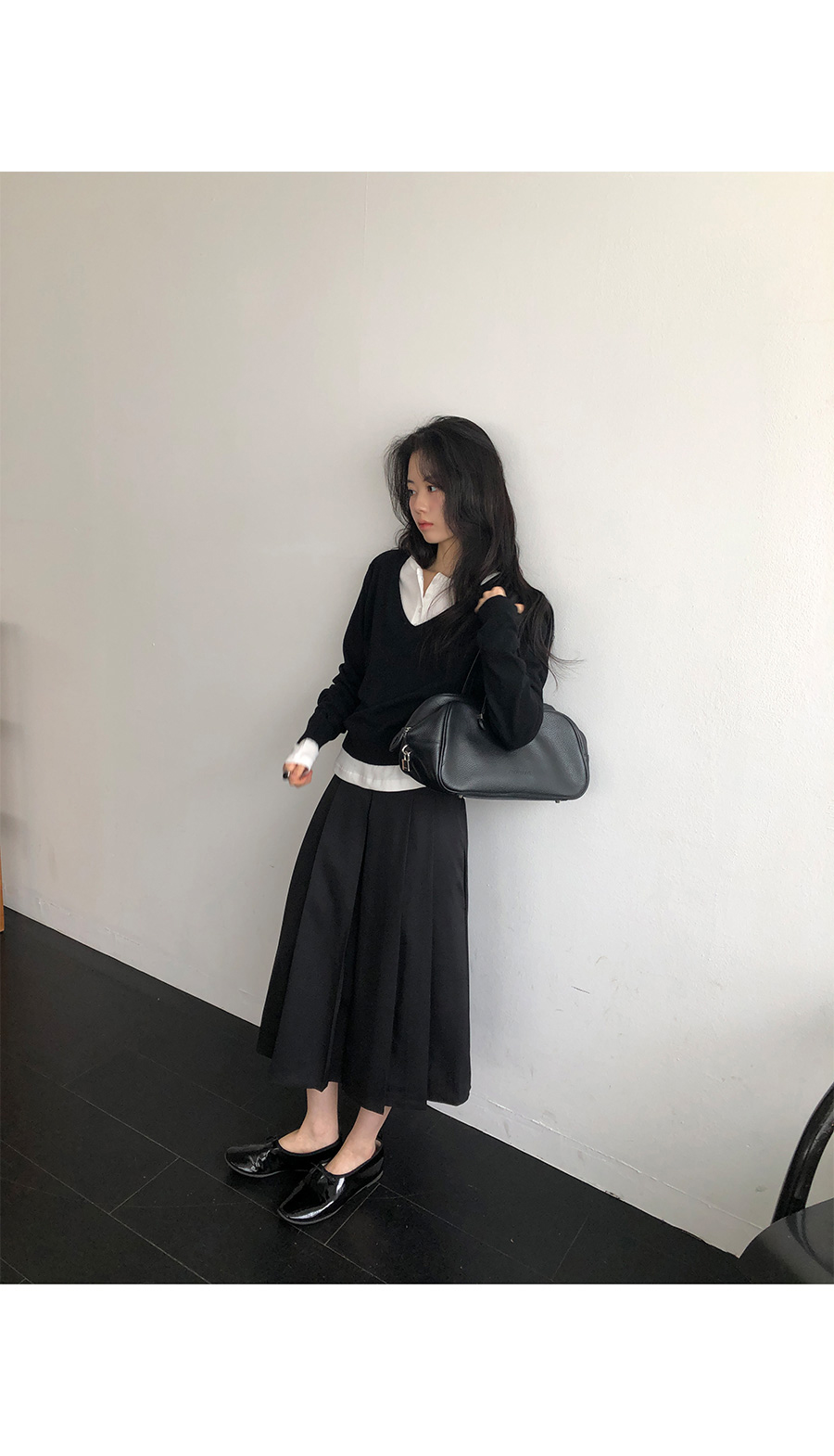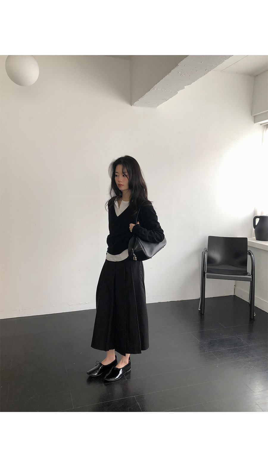 版型設計上,流暢且俐落的直筒剪裁讓身形看起來更為單純端正。領口的排扣可以根據心情自由調整:全扣時顯得端莊知性,解開幾顆則多了一份隨性不羈。特別加長的袖長設計能輕輕覆蓋手背,營造出一種柔和纖細的視覺感,搭配上剛好蓋過骨盆的長度,不管是紮進高腰褲或是自然垂落,都能輕易與針織衫、開襟外套疊穿出多變的風格。