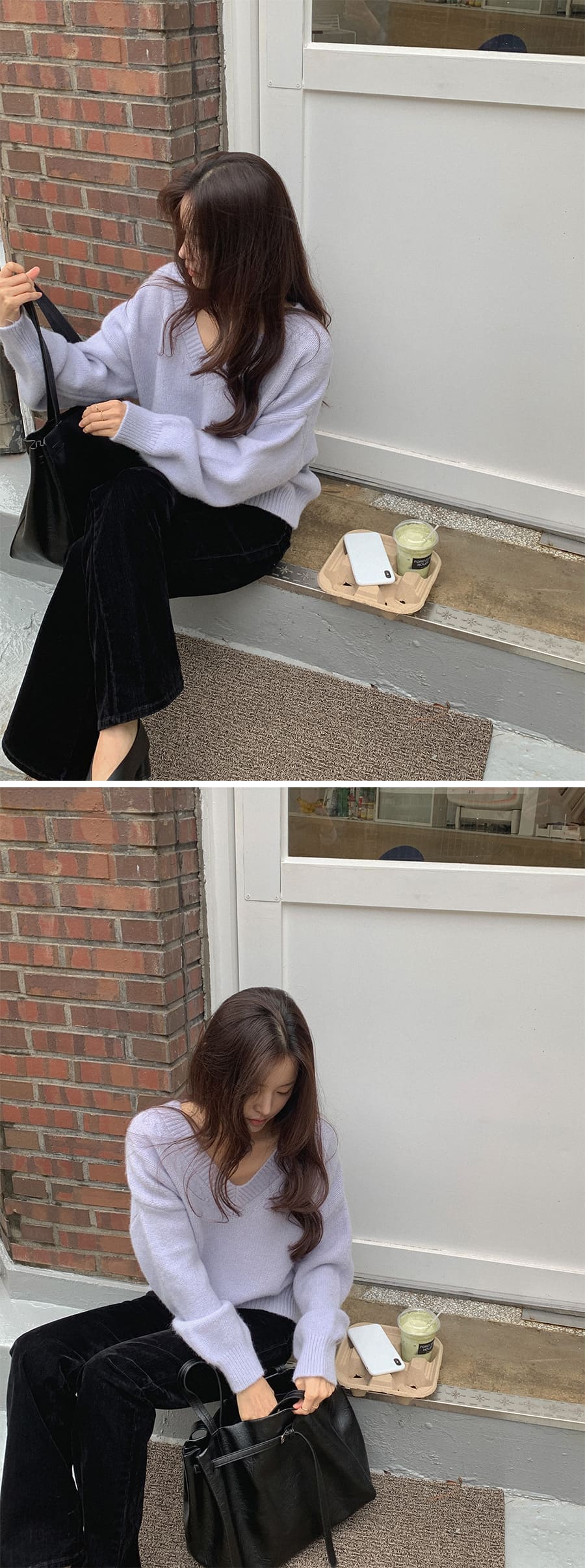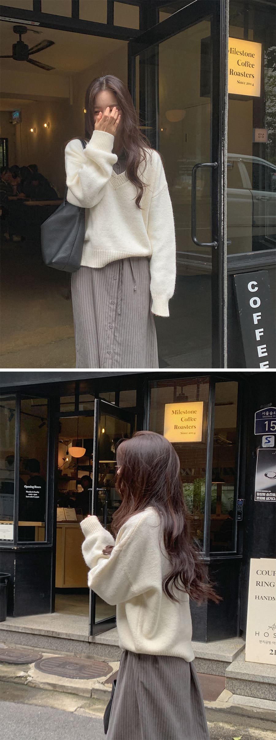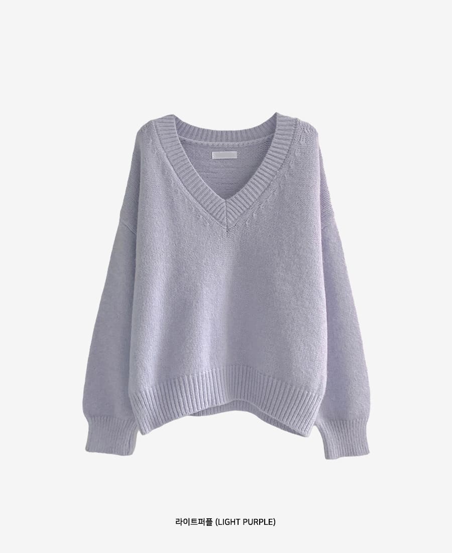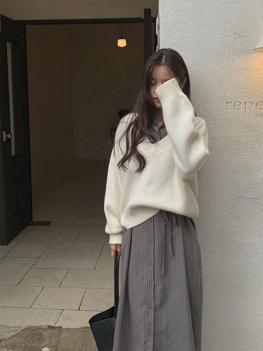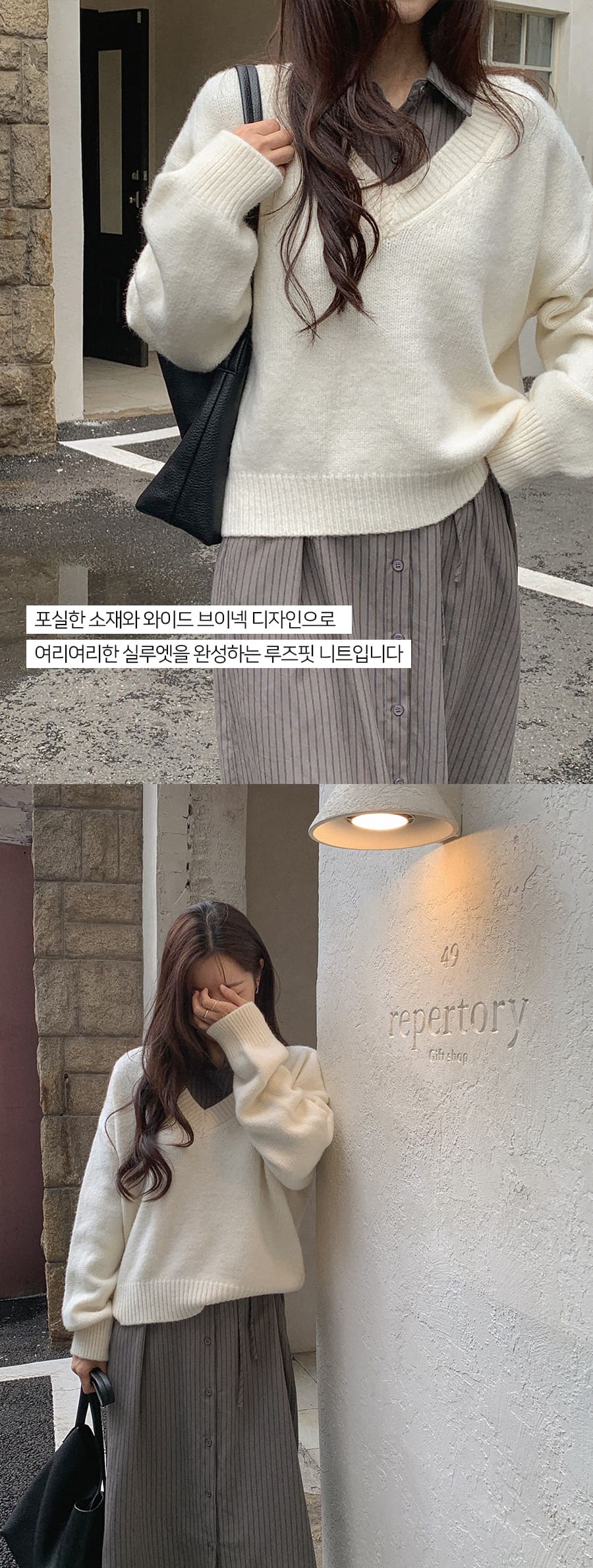 寬V領設計,展現柔美氛圍的寬鬆針織上衣。
